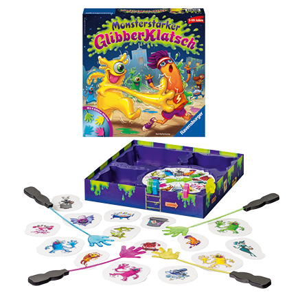 Hier ist Action angesagt. Mit Glibberhänden muss das zuvor vom Drehpfeil „erwählte“ Monster schnellstmöglich abgeklatscht werden. Wer erfolgreich war, darf von Glibberklecks zu Glibberklecks ziehen. Der Spieler der als erstes wieder die Leiter erreicht hat, ist Sieger.