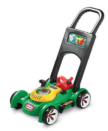 Der Rasenmäher ist aus robustem Kunststoff gefertigt und eignet sich besonders für das Spielen draußen. Er wird durch das Ziehen an einer Schnur gestartet, das bunte, hüpfende Kugeln in Bewegung setzt. Alles funktioniert mechanisch und ohne Batterien. Wie bei einem richtigen Rasenmäher sind ein Schlüssel, ein beweglicher Geschwindigkeitsregler sowie ein abnehmbarer Benzinkanister im Lieferumfang enthalten.