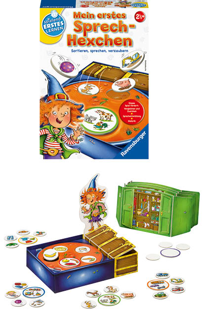 Das Spiel „Mein erstes Sprech-Hexchen“ fördert das Zuordnen, Vergleichen und genaues Hinsehen beim Kategorien-Finden von alltäglichen Gegenständen, die auf Kärtchen abgebildet sind. Nachdem man sich für die passenden Kärtchen der gefragten Kategorie entschieden hat, werden diese in den Zauberkessel gelegt. Die Rückseite der Karten zeigt, ob die Zuordnung richtig ist: Stimmen die Farben überein, darf der Zauberkessel mit einem Zauberspruch gerührt werden und die Kärtchen fallen als Zutaten für den Zauberbrei hinein.