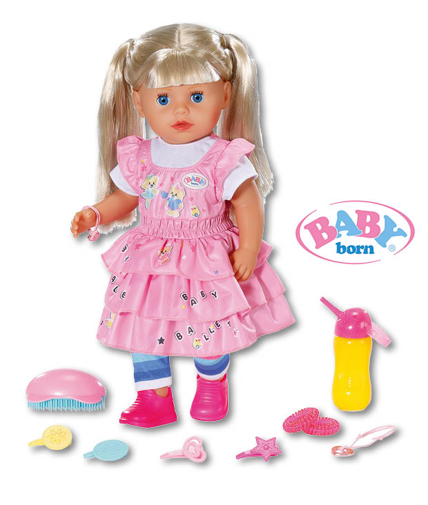 „Baby born® Kindergarten Little Sister“ ist eine 36 cm große Puppe, die ein rosa Kleid mit gestuftem Rock, bunt geringelte Leggings und pinke Schuhe trägt. Sie fasst sich dank dem „Soft-Touch-Körper“ weich an und kann trinken, weinen, schlafen, baden, alleine stehen und ist sehr beweglich. Mit der mitgelieferten Bürste, den Haargummis und den Haarklammern kann die Puppe frisiert werden. Sie bringt zusätzlich noch eine Trinkflasche mit Kappe und je ein Freundschaftsarmbändchen für Puppe und Kind mit.